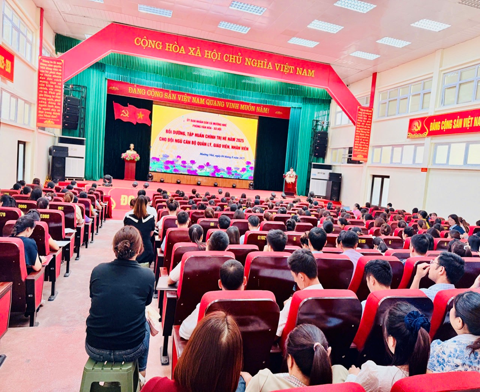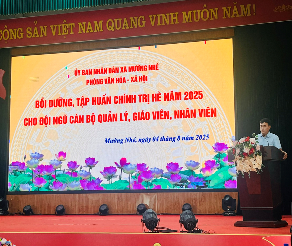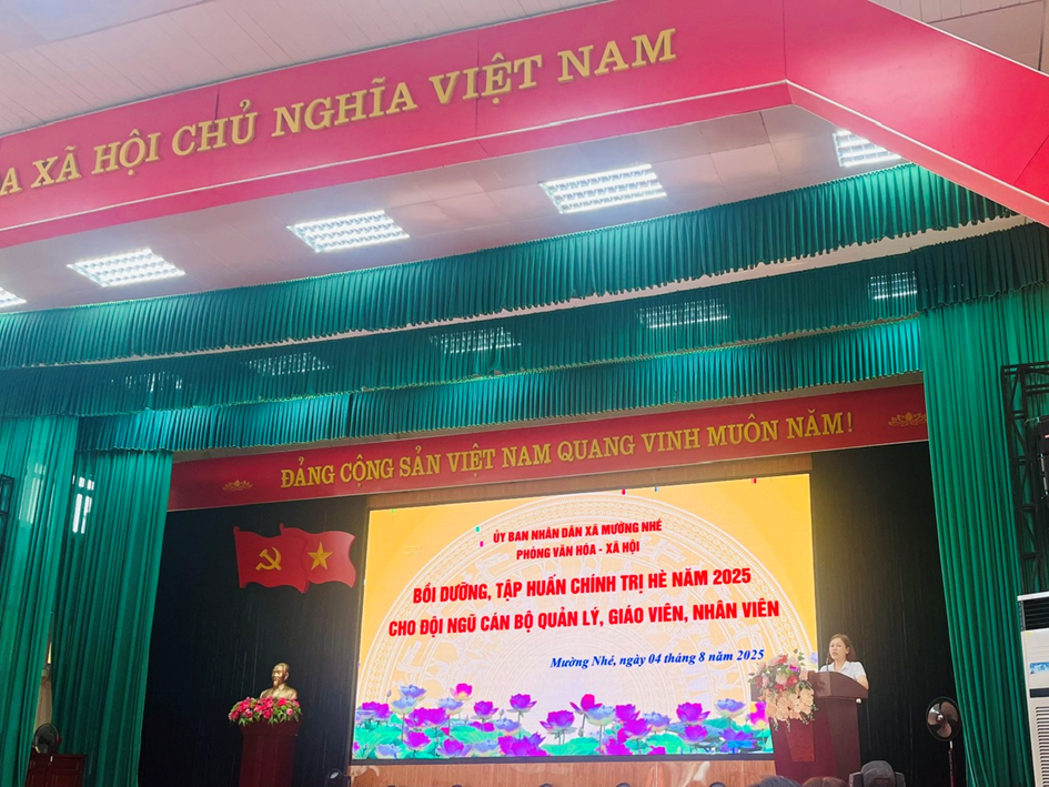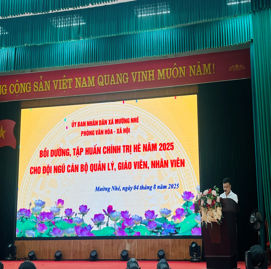 Ngày 04/8/2025, Phòng Văn hóa - Xã hội xã Mường Nhé đã tổ chức bồi dưỡng chính trị hè cho hơn 500 cán bộ quản lý, giáo viên, nhân viên giáo dục và đào tạo các trường Mầm non, tiểu học, THCS trên địa bàn xã bằng hình thức trực tiếp tại Trung tâm Hội nghị Văn hoá xã Mường Nhé.