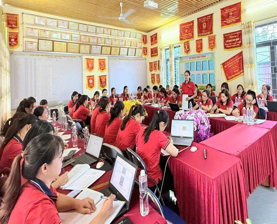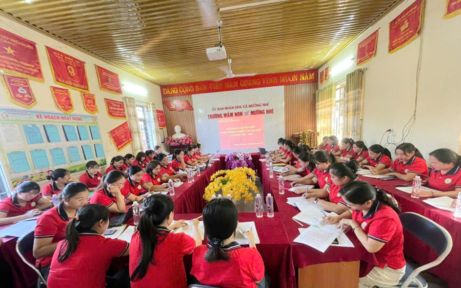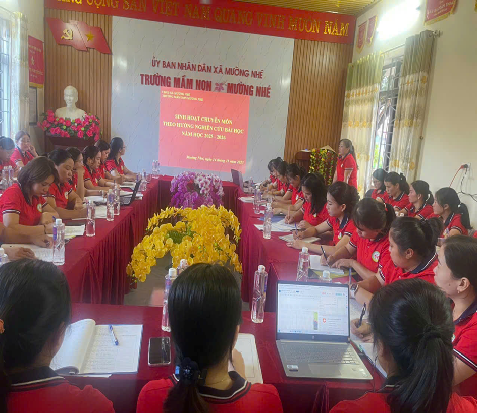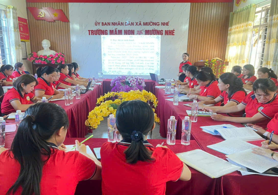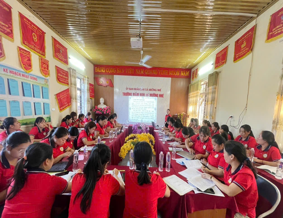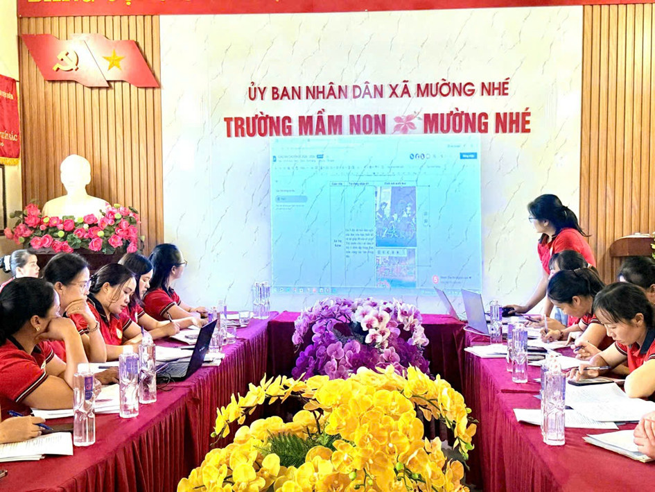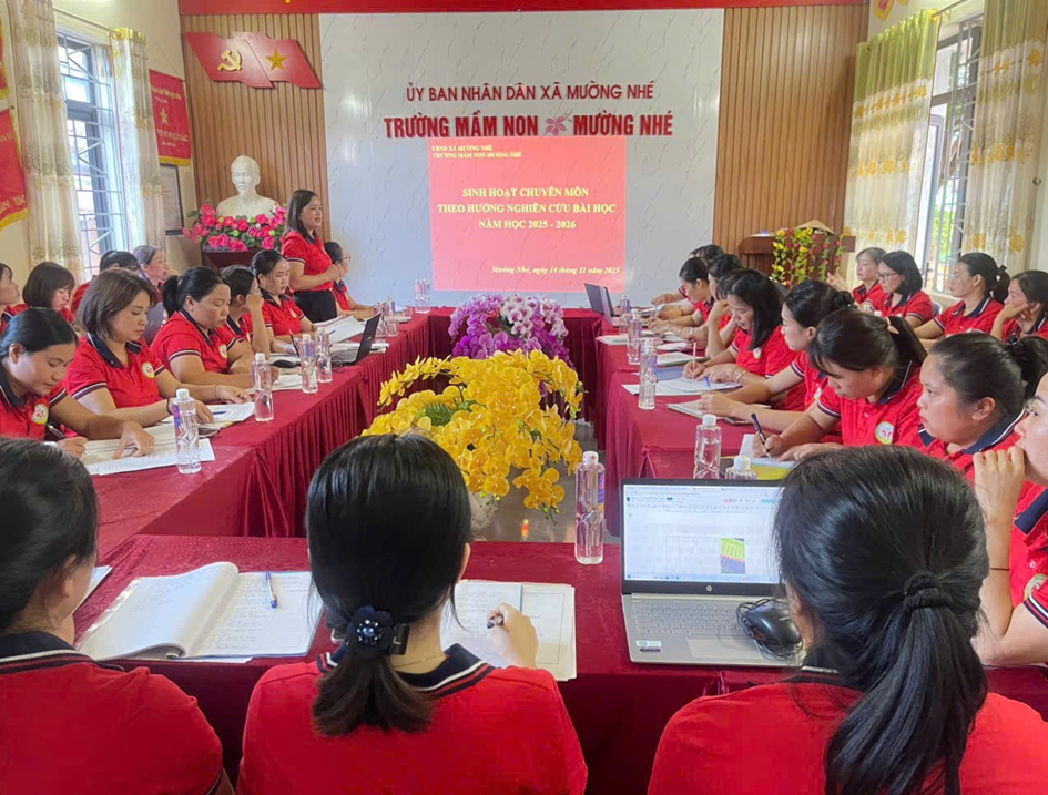 📚 Thực hiện kế hoạch Số: 79/KH-MNMN ngày 15 tháng 9 năm 2025 Kế hoạch sinh hoạt chuyên môn theo hướng nghiên cứu bài học, năm học 2025- 2026, Hưởng ứng phát động thi đua Dạy tốt - học tốt chào mừng kỷ niệm 43 năm Ngày Nhà giáo Việt Nam (20/11/1982 - 20/11/2025) chiều ngày 14/11/2025, Trường Mầm Non Mường Nhé tổ chức buổi sinh hoạt chuyên môn theo hướng nghiên cứu bài học với sự tham gia của Ban giám hiệu và toàn thể giáo viên trong trường.